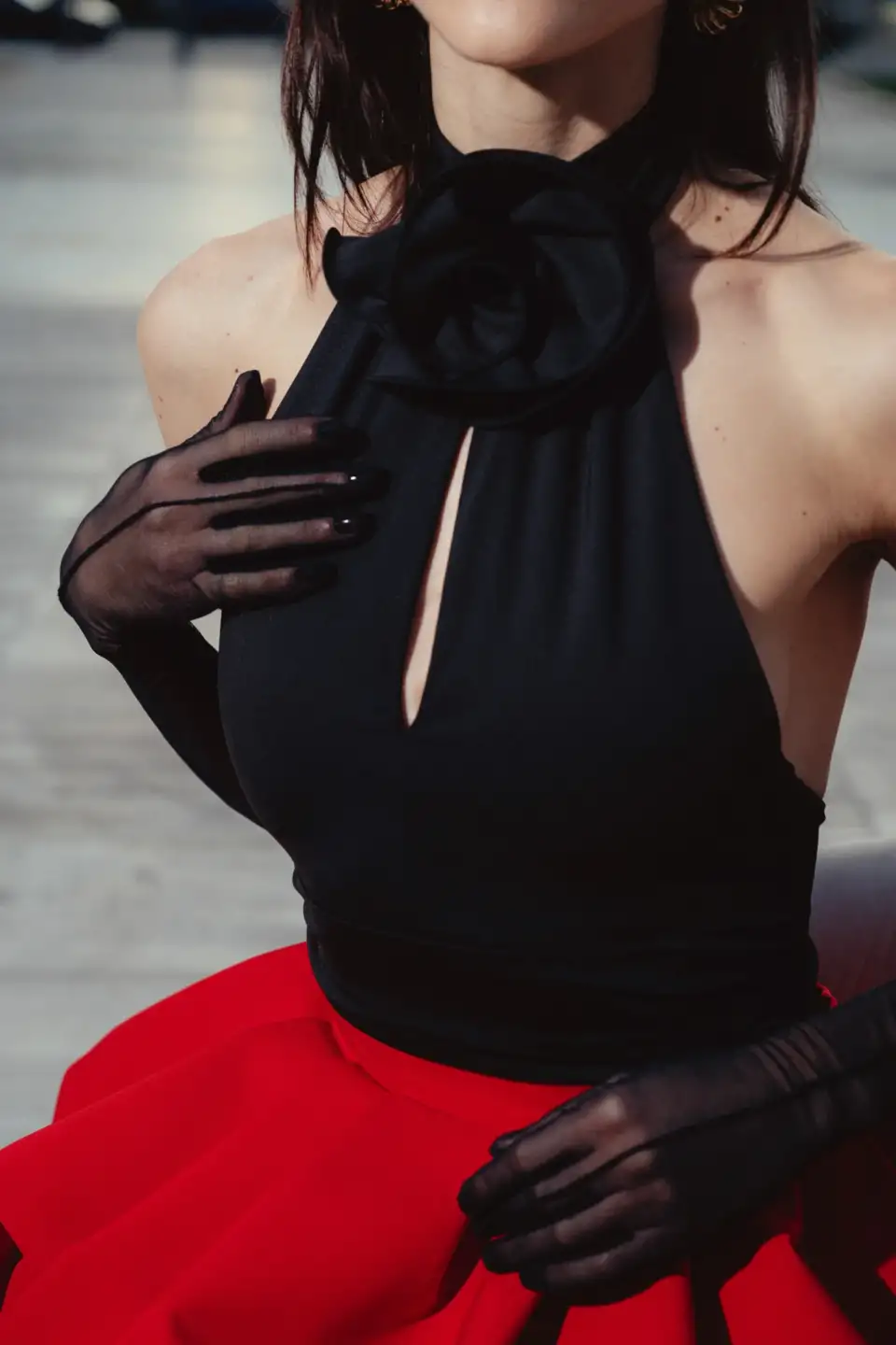 FLOWER APPLIQUÉ HALTERNECK BODYSUIT IN BLACK
