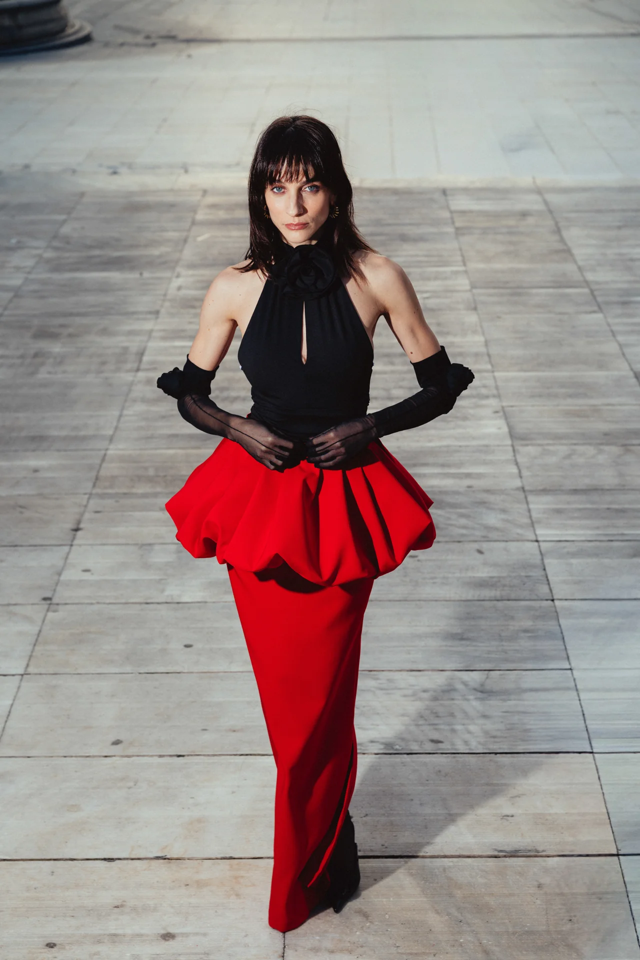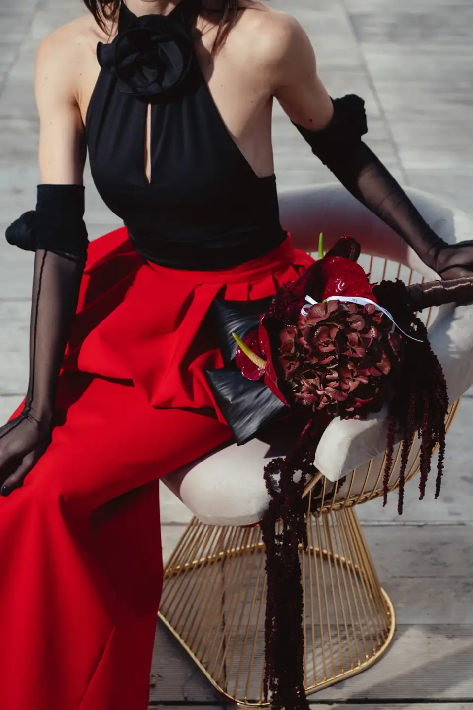 A stretchy and tight fitted halterneck bodysuit with a keyhole cutout at the chest and a draping detail on the waist. Designed with an open back and a high neck collar fastening with our signature Rose Buttons on the back. Adorned with a handmade 3D Appliqué Flower in the center front for a signature DES look.