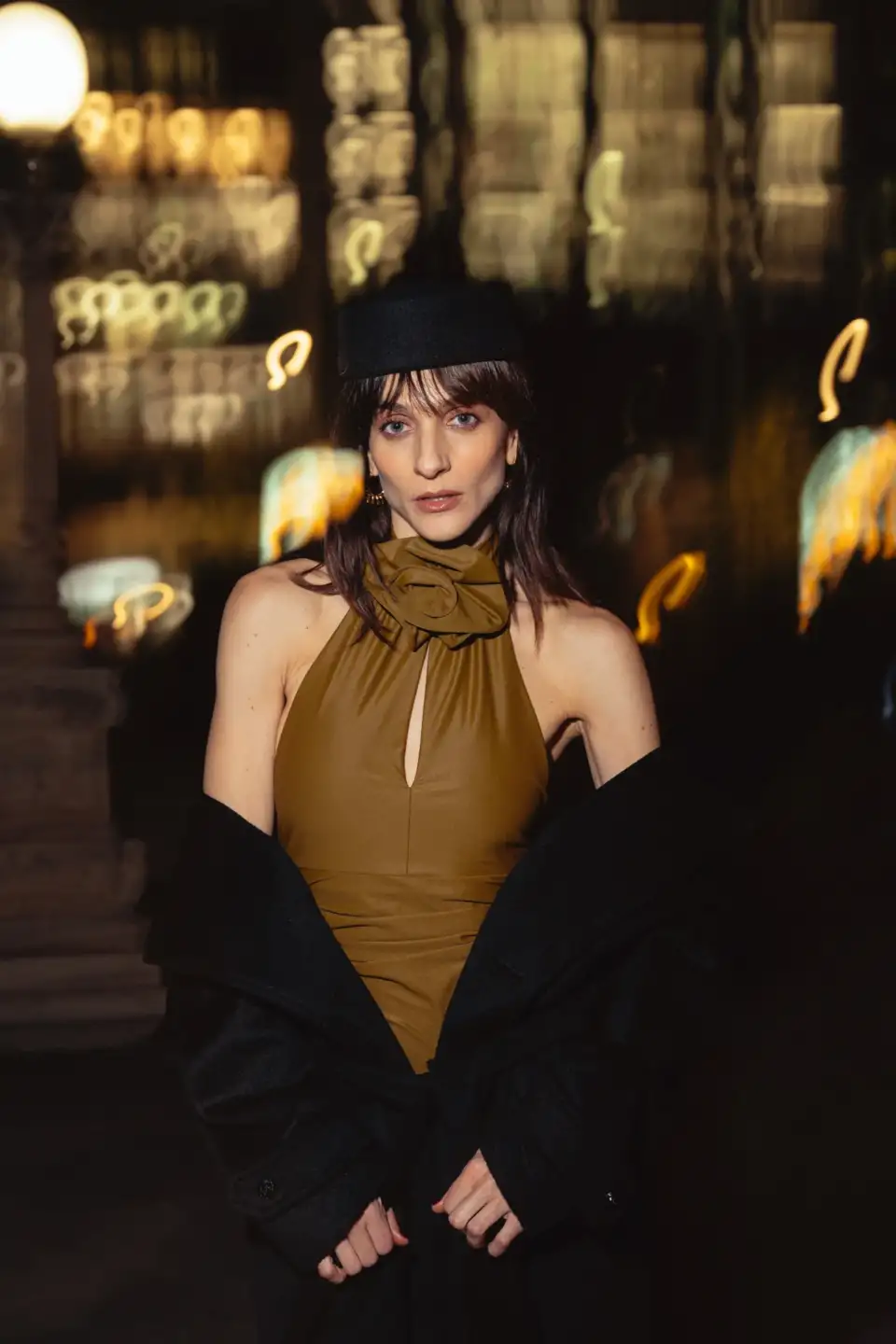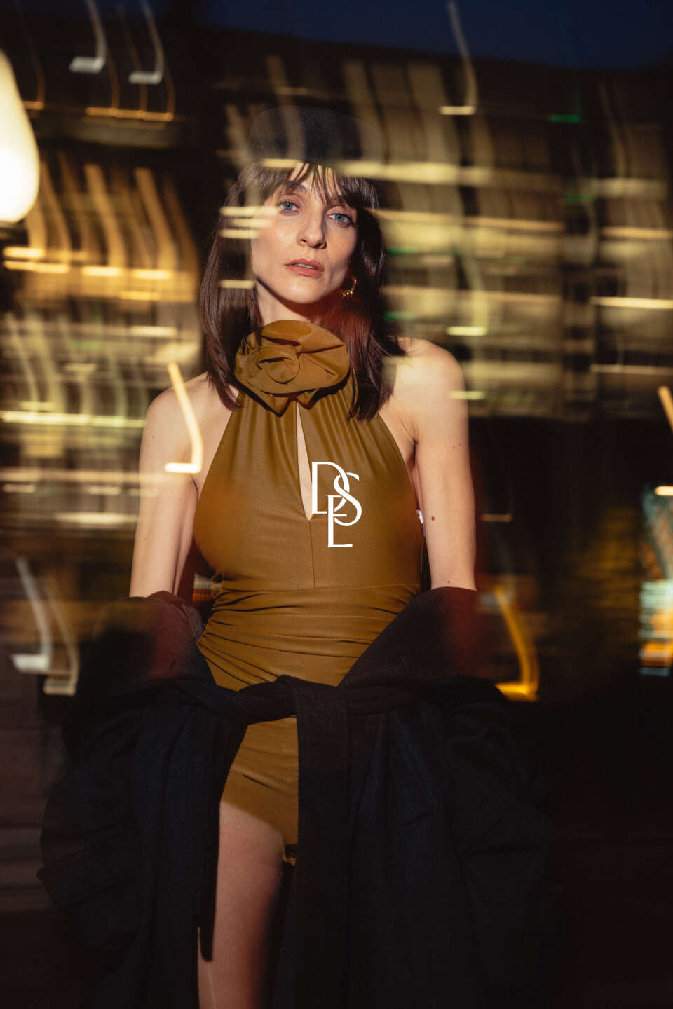 A stretchy and tight fitted halterneck bodysuit with a keyhole cutout at the chest and a draping detail on the waist. Designed with an open back and a high neck collar fastening with our signature Rose Buttons on the back. Adorned with a handmade 3D Appliqué Flower in the center front for a signature DES look.