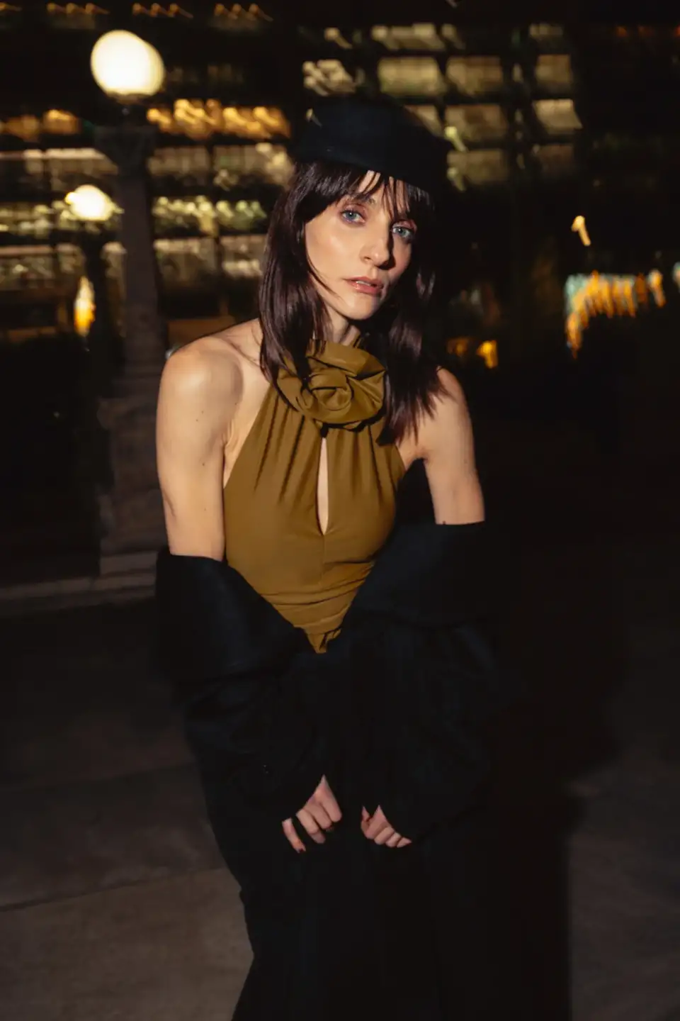 FLOWER APPLIQUÉ HALTERNECK BODYSUIT IN KHAKI DORÉ