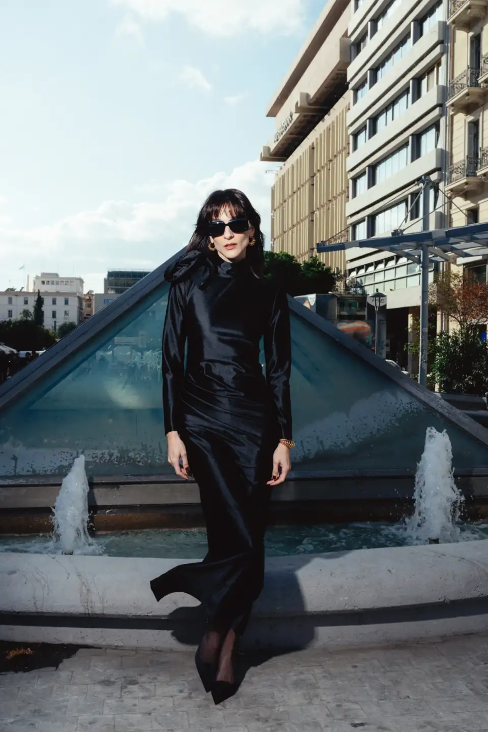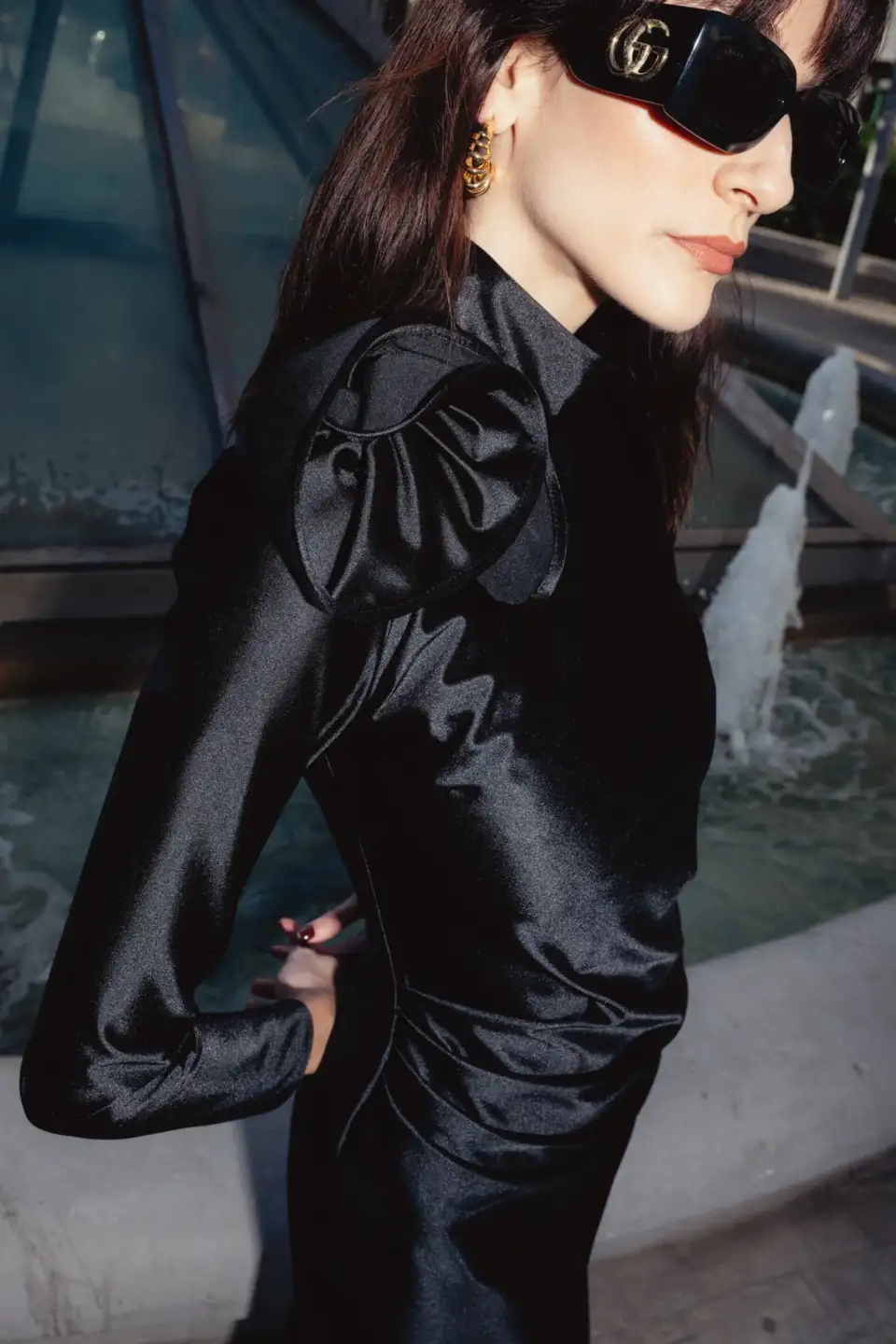 A longsleeve maxi gown designed with a draping detail on the waist and a high neck collar. Fastening with an invisible zipper and our signature Rose Button on the back neck. Adorned with a hanmade 3D Appliqué Flower on the right shoulder for a statement DES look.